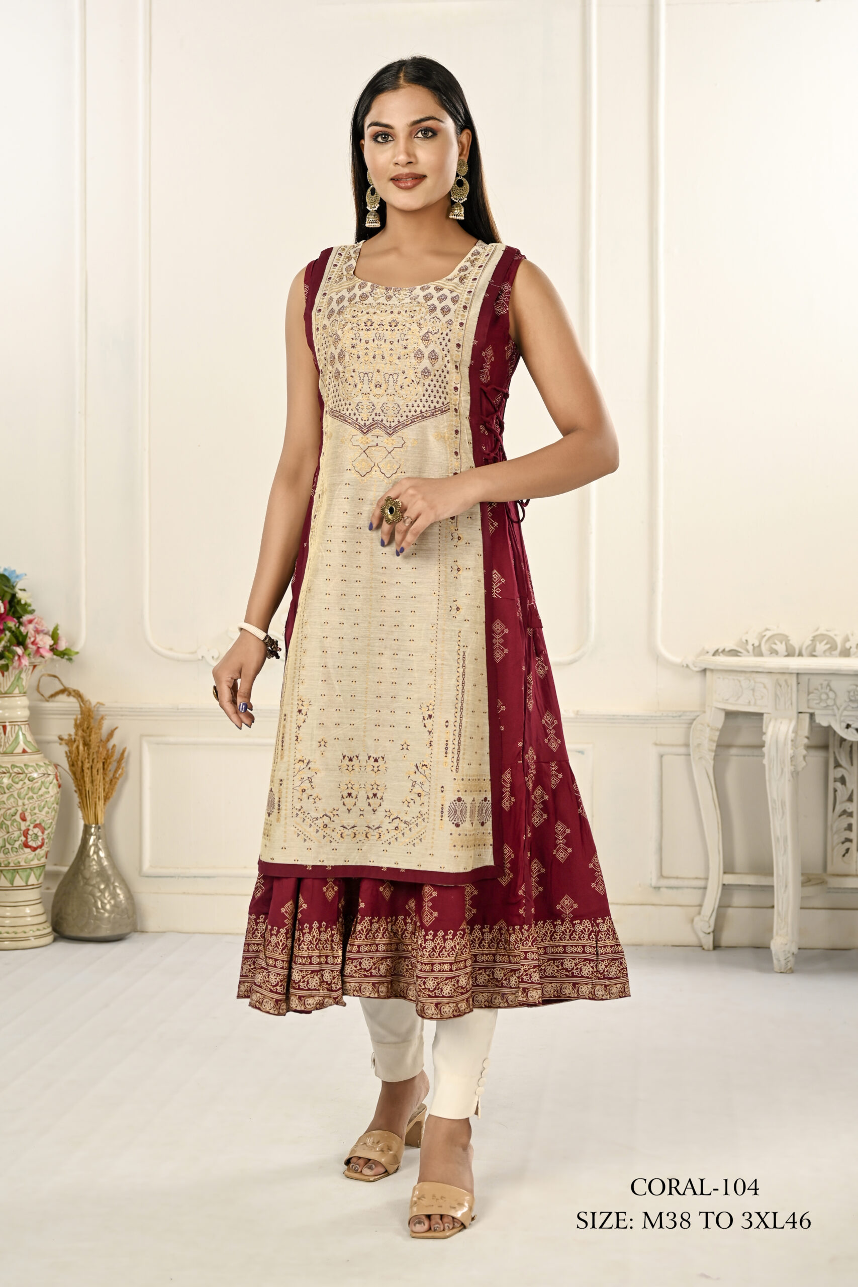 This chic Cream and Maroon Kurti is crafted from a blend of Chanderi and cotton for a contemporary look. With a printed outward jacket and comfortable fit, it is perfect for everyday styling.