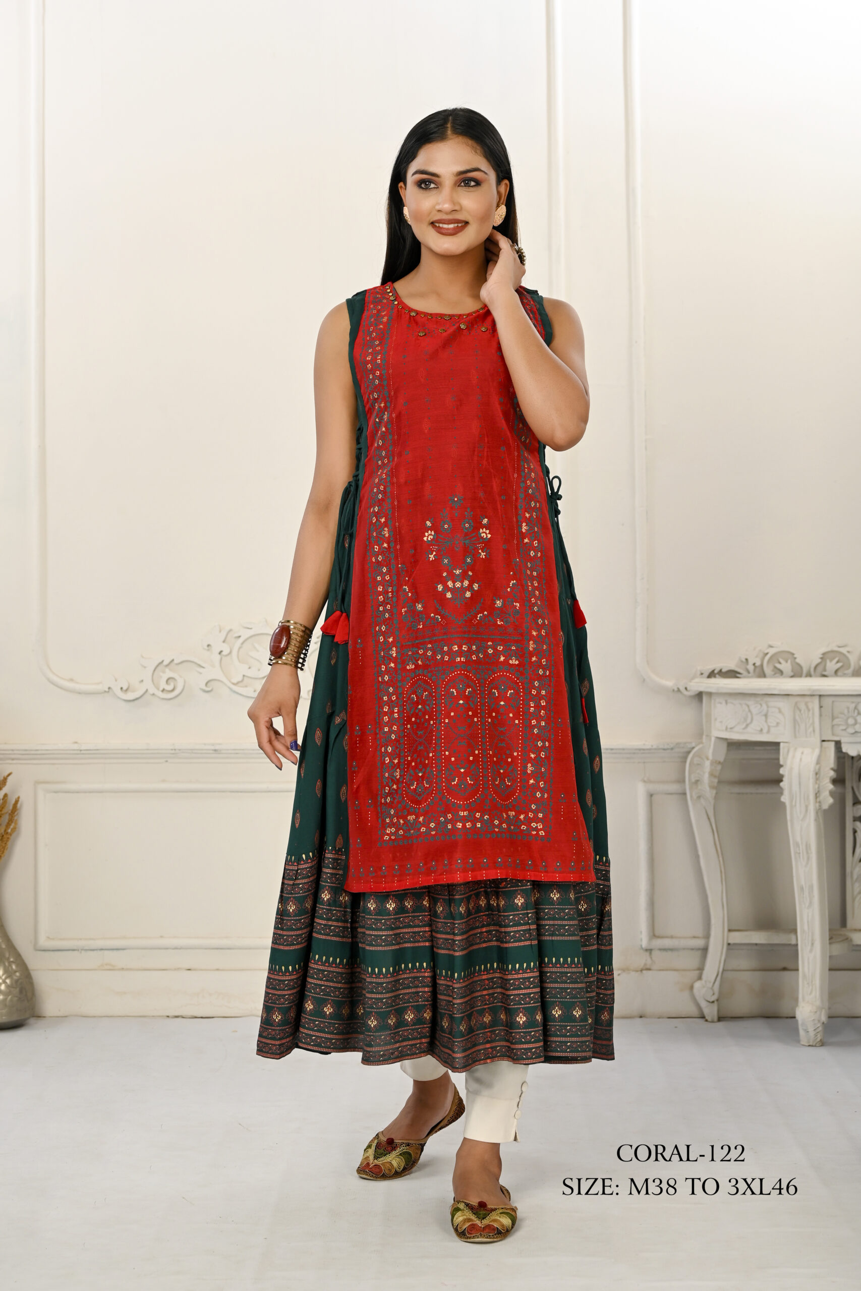 2 Layered Inner Cotton And Outward Jacket Chanderi Kurti – Red And Blue