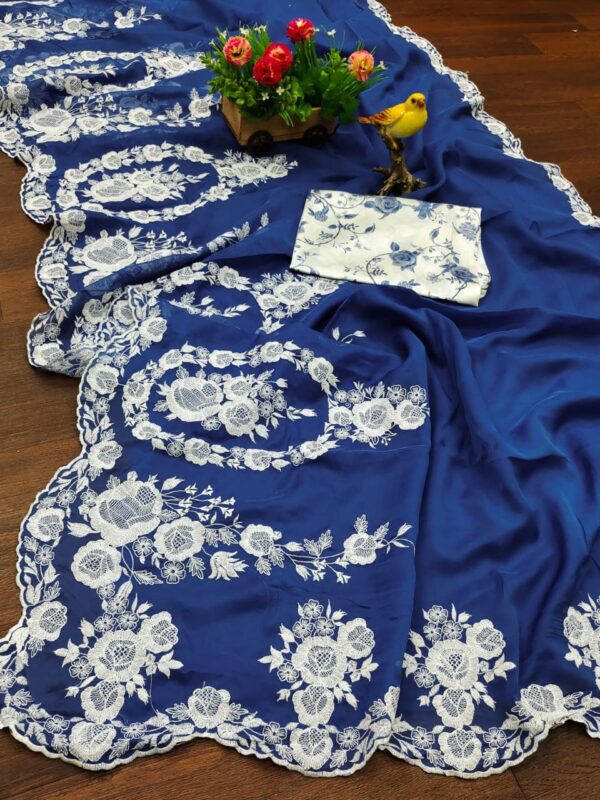 This collection features Thai Organza Silk sarees with intricate thread embroidery work and a cutwork border, highlighting the craftsmanship. The sarees are pure and come in a variety of 4 beautiful colors. The accompanying blouse is made of heavy sartin and features a stunning designer floral digital print. The blouse is unstitched with a pattern of 0.80. Overall, it sounds like a sophisticated and stylish collection.