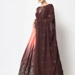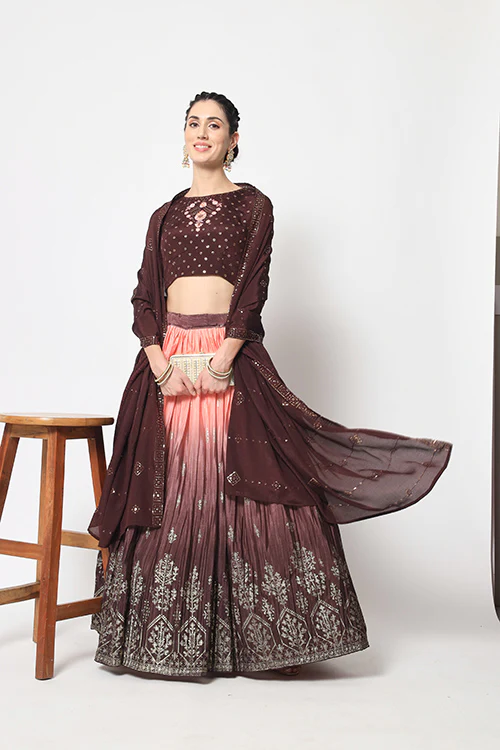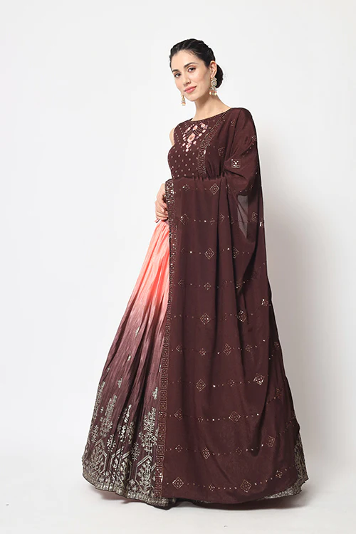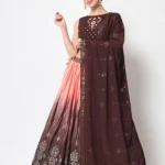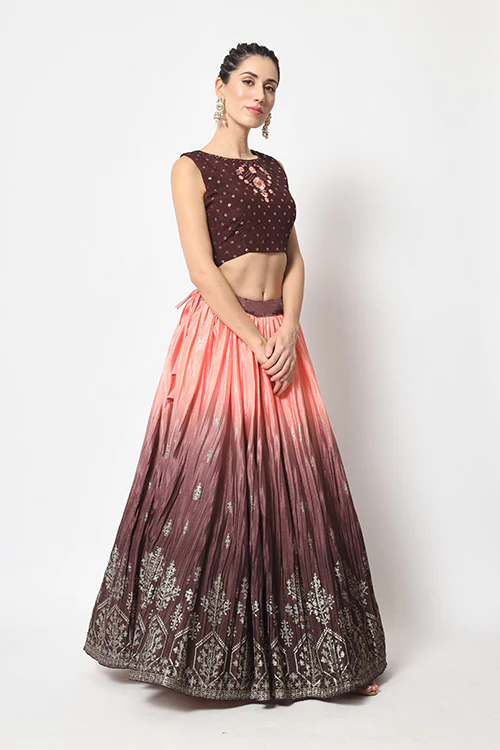 Brown Chinon Silk Foil Printed Work Lehenga.