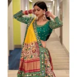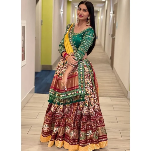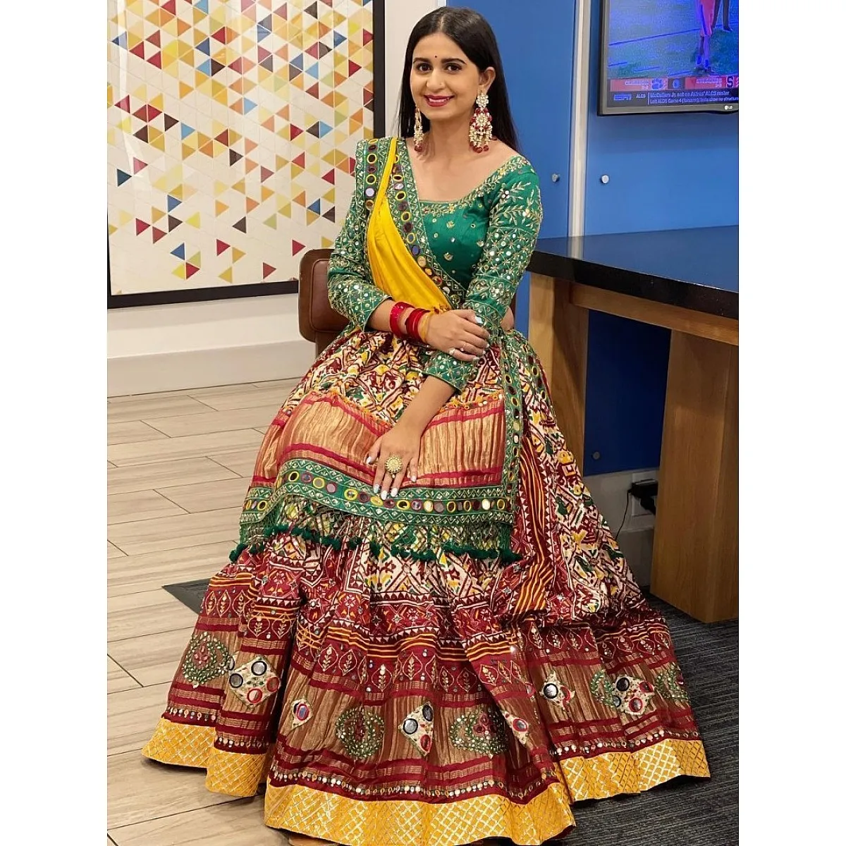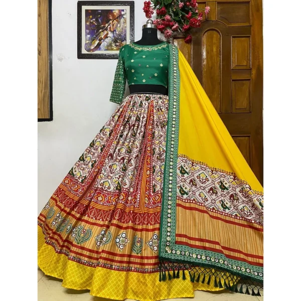 This Cotton Lehenga Collection features a semi-stitched muslin cotton lehenga with digital print and real mirror work. The lehenga comes with a silk inner lining and has a 4-meter flair with canvas support. The blouse is unstitched and made from muslin cotton with real mirror work. The muslin cotton dupatta also has real mirror work and is 2.10 meters long. This collection includes all three pieces: lehenga, blouse, and dupatta, making it a complete outfit.