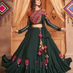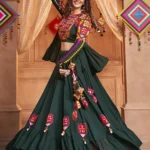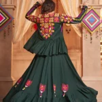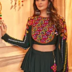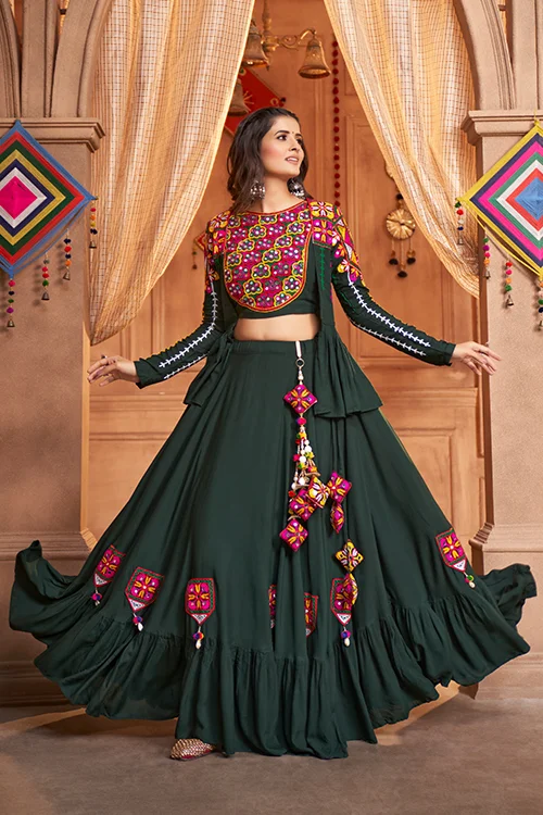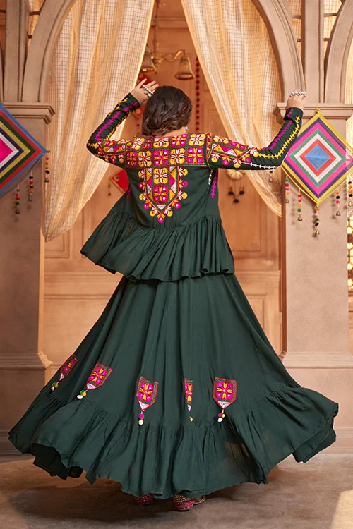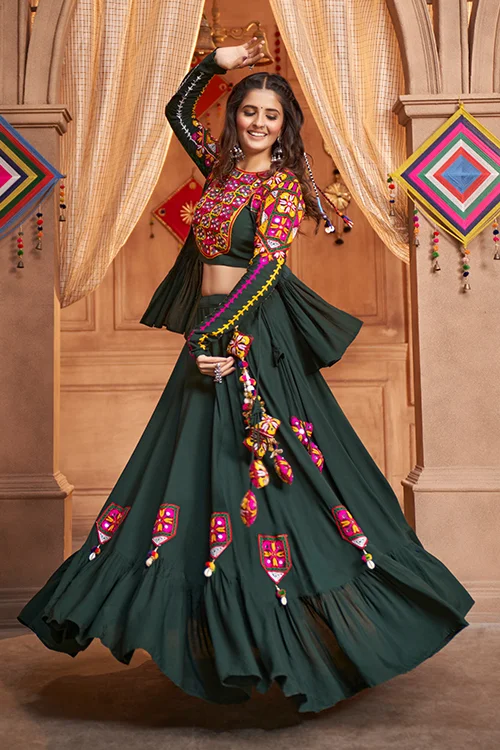 Green Viscose Rayon Embroidered Mirror Work Navratri Festival Chaniya Choli Collection