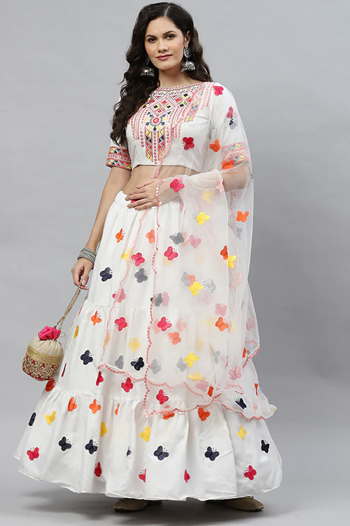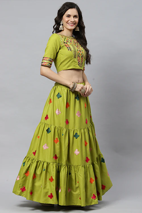 Beautiful Cotton Multi Embroidered Work Lehenga Choli Price range: ₹1,999.00 through ₹2,399.00