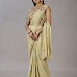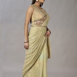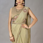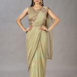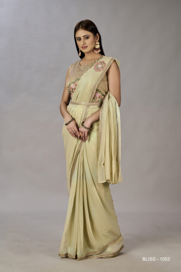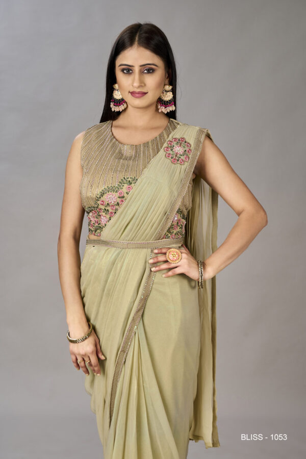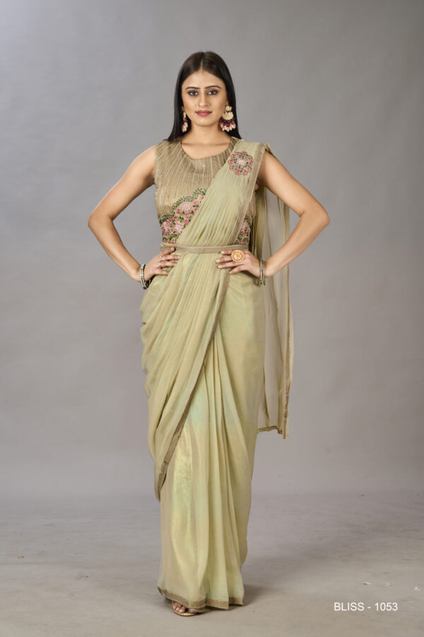 This stunning ready-to-wear saree features light green shimmer georgettes with delicate embroidery and sequins work. The elegant broach on the pallu and waist belt completes the look, making it the perfect choice for special occasions.