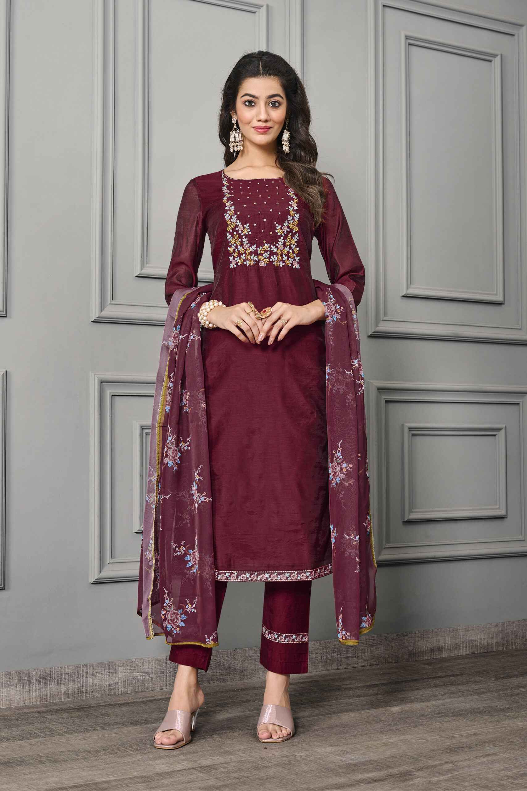 Maroon Cotton Silk With Organza Embroidery Salwar Kameez