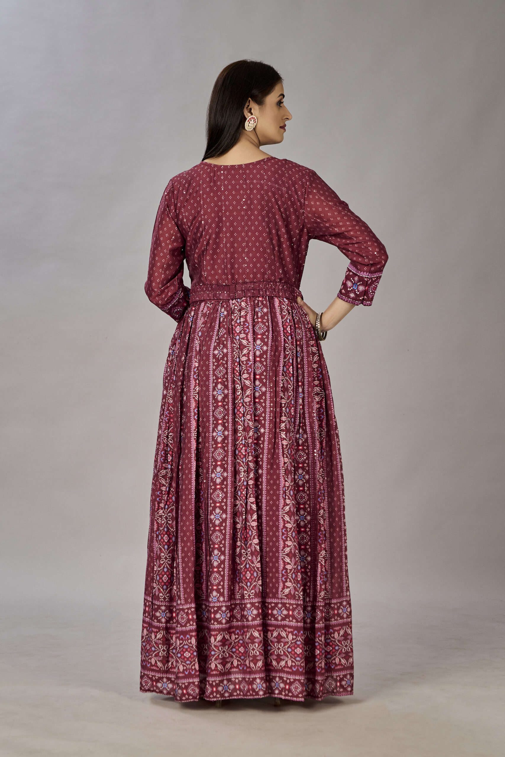 This Maroon Gown is a timeless piece crafted with muslin silk and adorned with intricate digital prints and embroidery detailed with sequins. The maroon color along with the heavy design will leave you feeling like a royal.