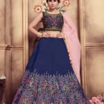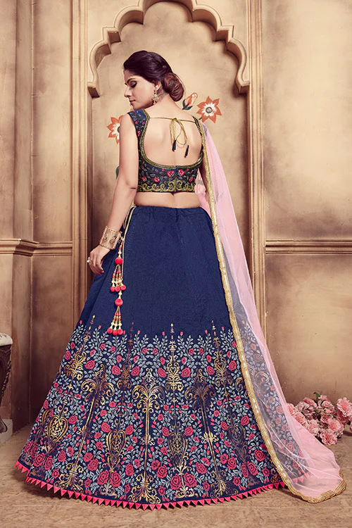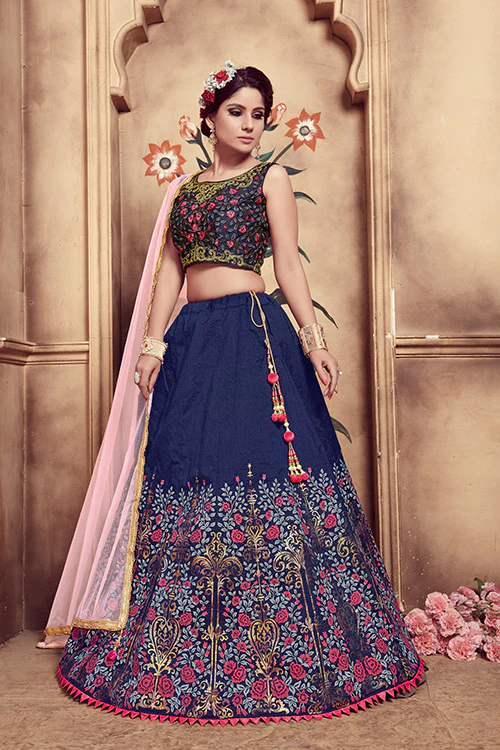 This Semi-Stitched Lehenga Choli Set is a canvas of sophistication, featuring a navy blue silk lehenga adorned with stunning rubber foil work. The inner lining in crepe silk ensures comfort, making it an ideal choice for any occasion.