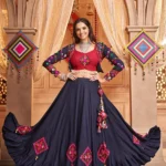 This Navy Blue Stylish Embroidered Koti Style Chaniya Choli is perfect for keeping up with the latest fashion trends while celebrating the festive season. Crafted with intricate embroidery, this fashionable design offers a stylish look like no other. Make this your go-to look for Navratri and beyond.