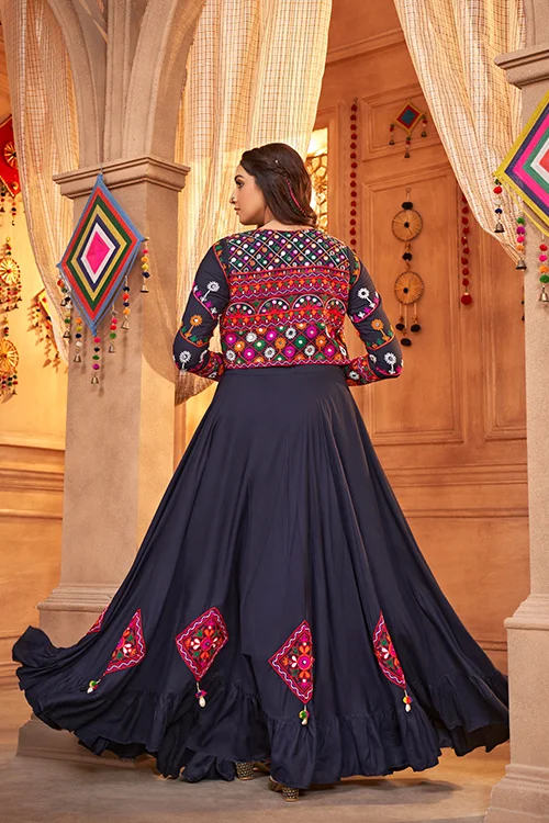 Navy Blue Stylish Embroidered Koti Style Chaniya Choli Latest Fashion Navratri Collection