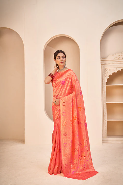 Peach Banarasi Silk Saree With Patola Weaving Silk