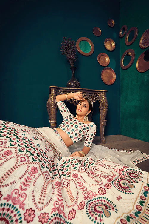 Elevate your bridal look with our Pearl White Georgette Wedding Wear Bridal Lehenga Choli Set. This stunning ensemble is a testament to timeless elegance, blending traditional craftsmanship with modern aesthetics.