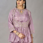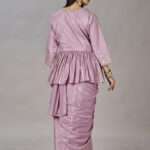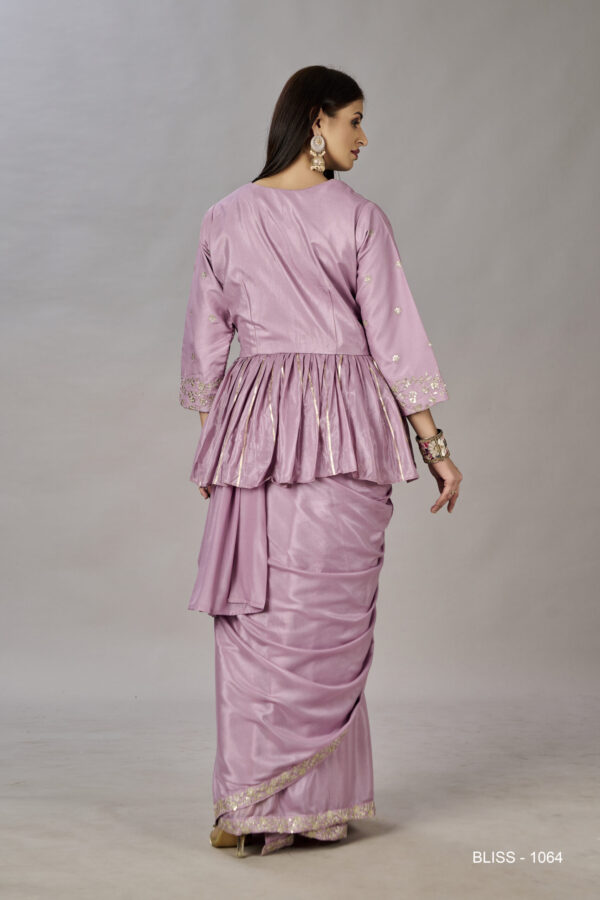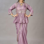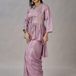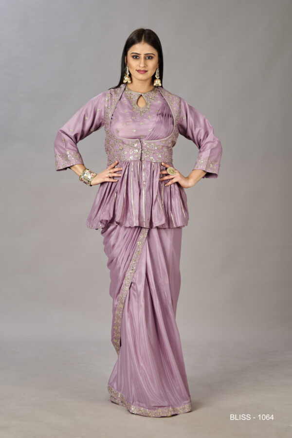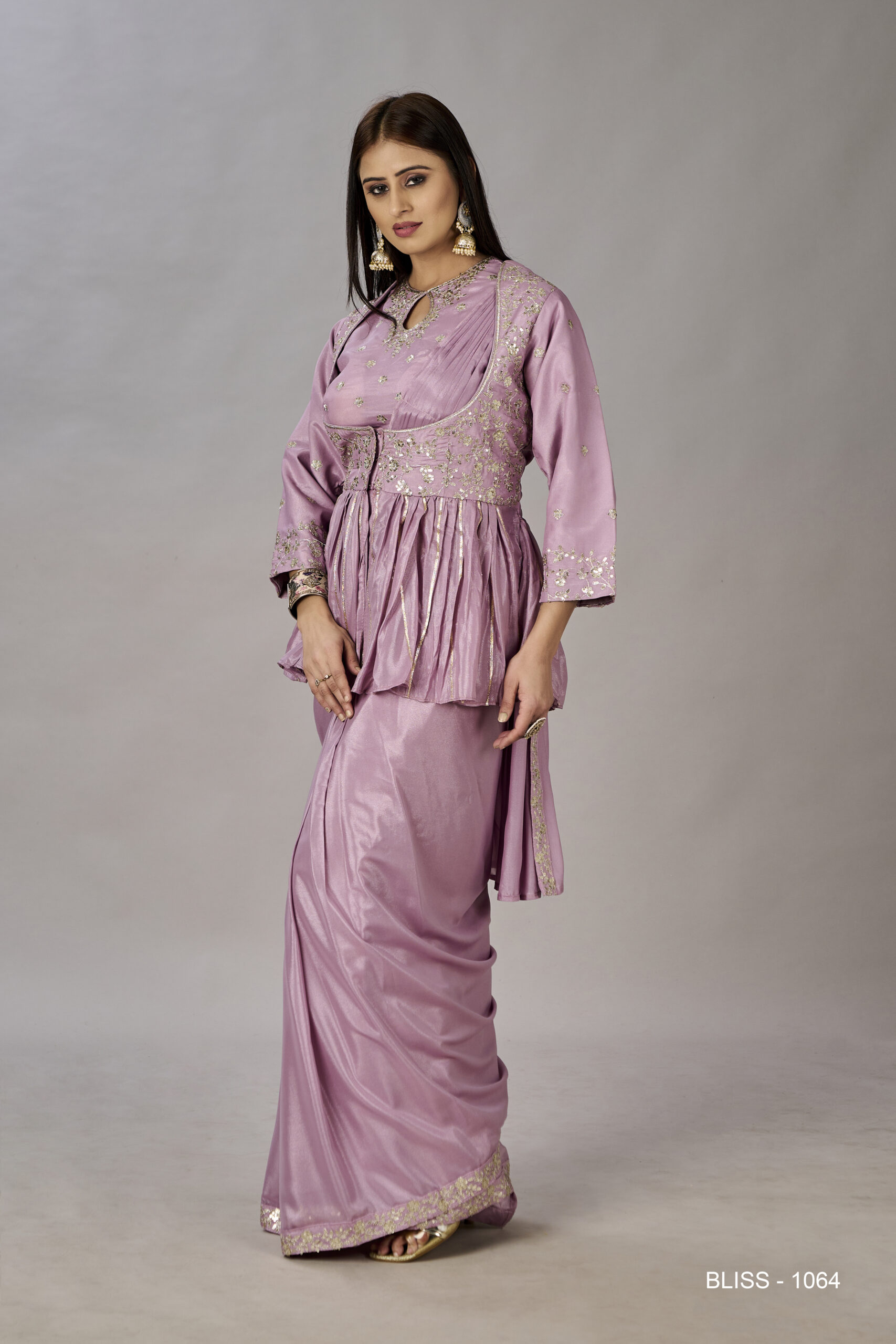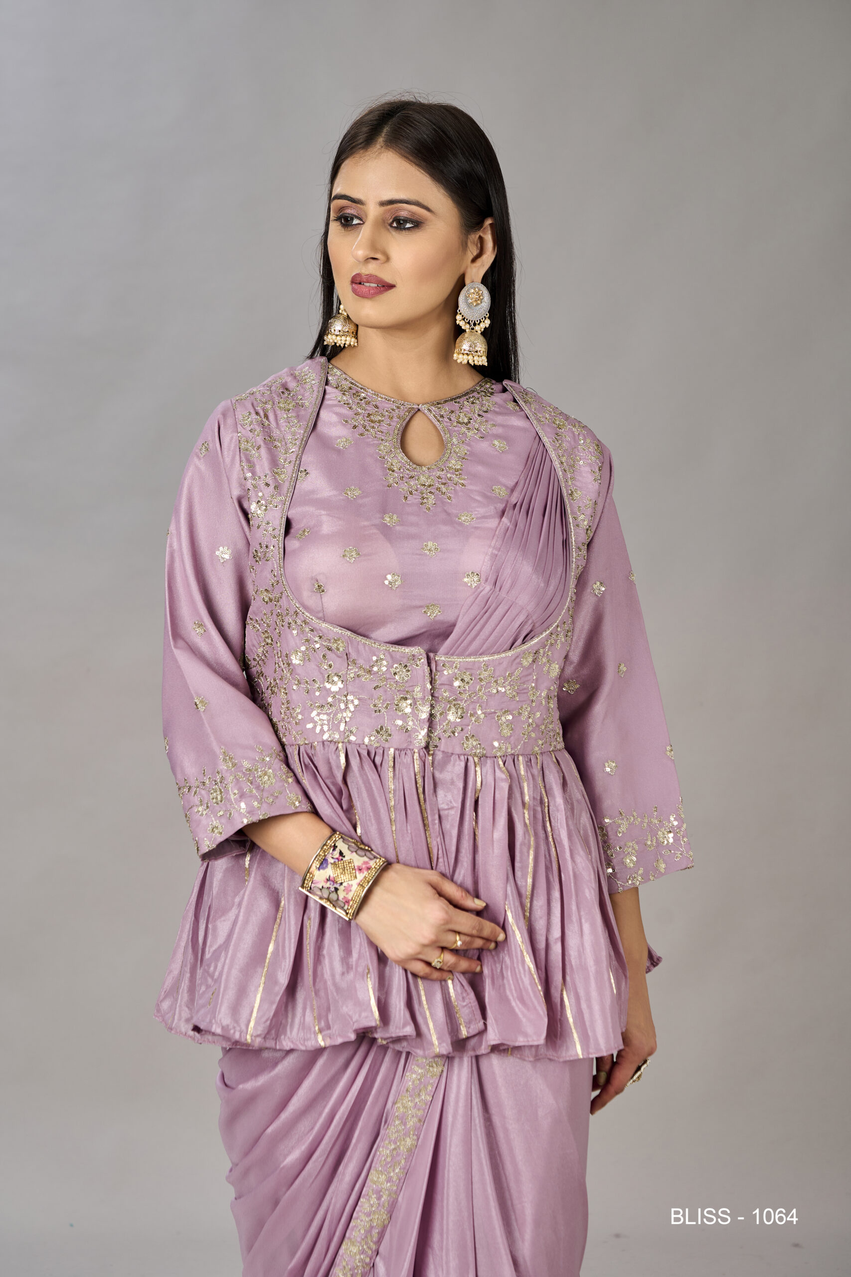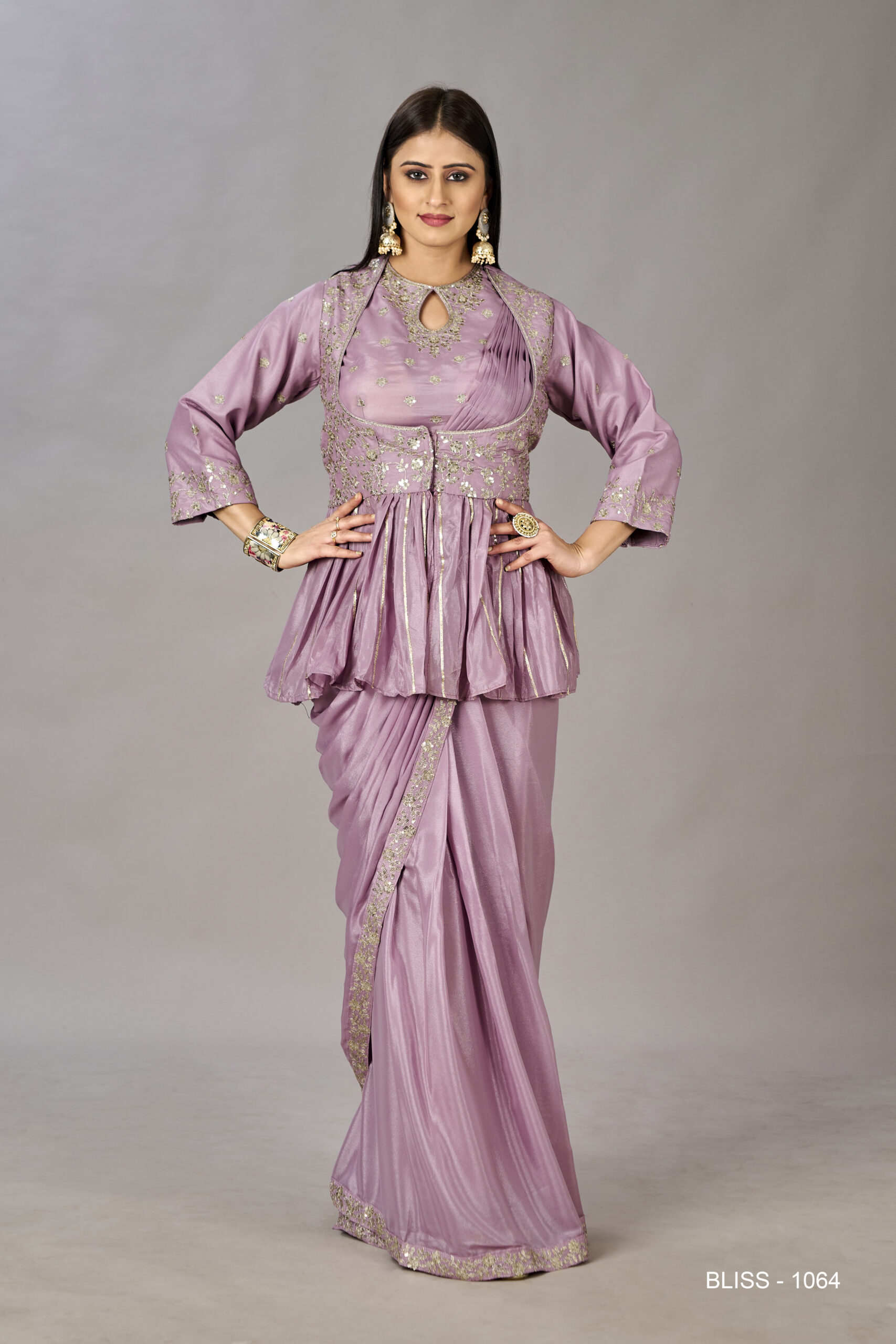 This Ready To Wear saree and stitched jacket style long blouse is the perfect balance of style and comfort. Crafted from pink shimmer georgettes and embellished with embroidery, sequins and a broach on the pallu, this saree is sure to turn heads. The long blouse also features a waist belt that accentuates the outfit further.