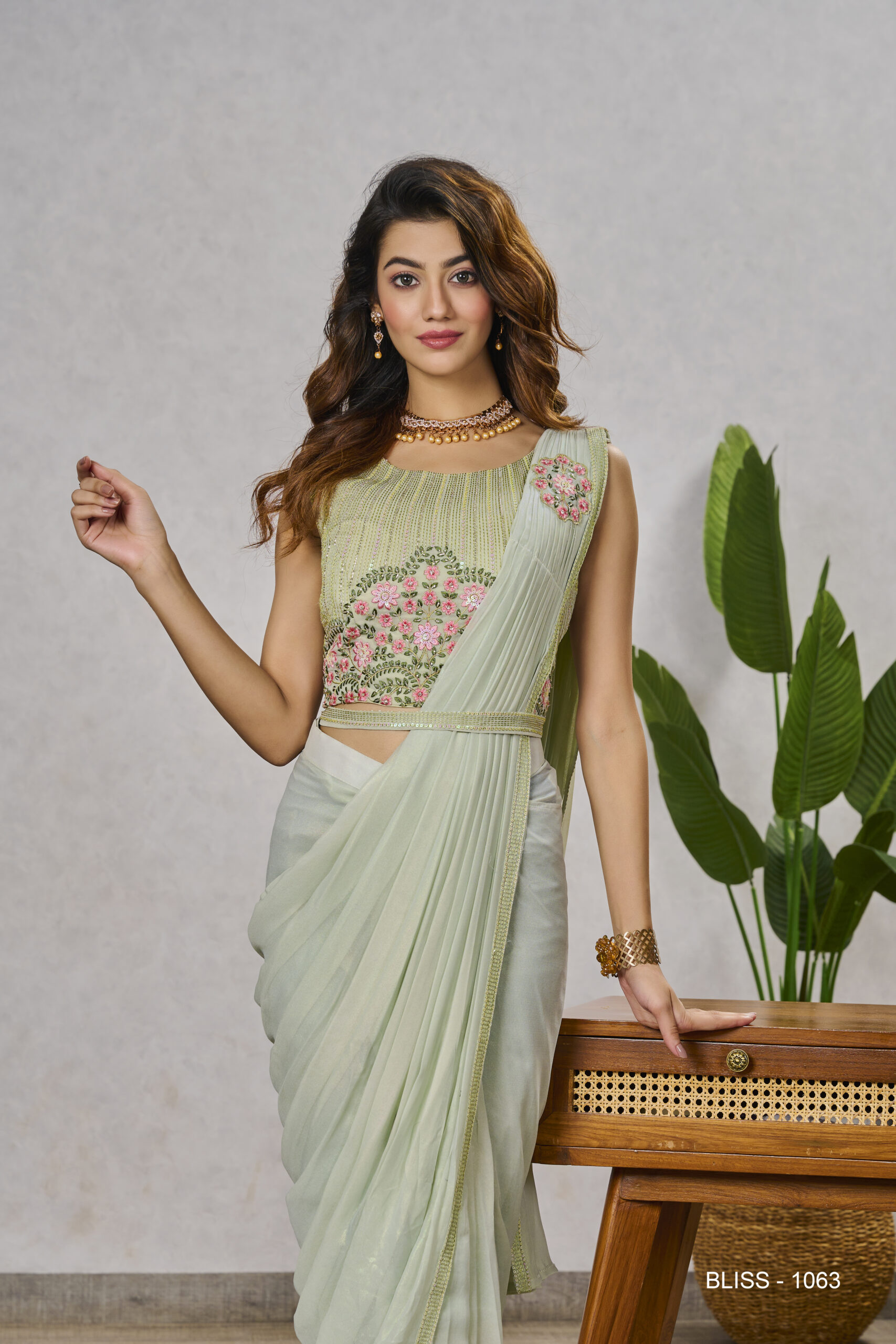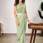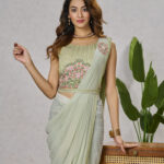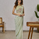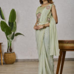 This saree and blouse combo combines Pista Green Shimmer Georgette fabric with embroidery and sequins work, plus a fixed broach on the pallu and waist belt. Boasting a unique, eye-catching design, this garment is perfect for special occasions.