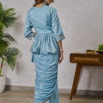 Look glamorous in this ready-to-wear saree & stitched jacket style long blouse featuring sky blue shimmer georgette, intricate embroidery and sequins work, broach on pallu, and waist belt. Create a stunning look with this eye-catching ensemble.