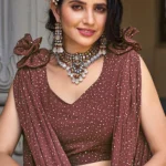 This Brown Georgette Metallic Foil Work Lehenga Choli is not just an outfit; it’s a statement. The metallic foil work with a crush pattern on the georgette fabric creates an enchanting appeal, perfect for special occasions. The plus-size design ensures a comfortable and flattering fit, while the 42-inch length of the lehenga adds an elegant touch.