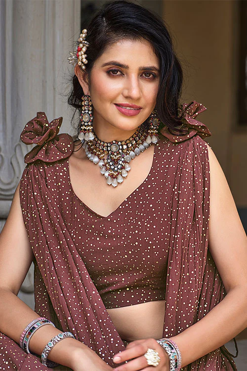 Look and feel stunning at every special occasion with this Brown Georgette Metallic Foil Work Lehenga Choli set. The skin-friendly yet lightweight fabric ensures comfort without compromising on style, making it a perfect choice for your next celebration.