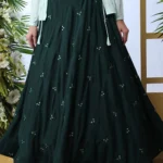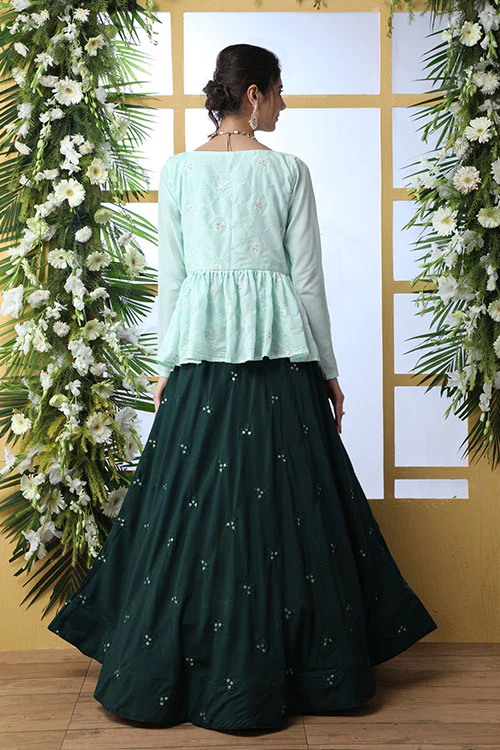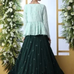 This Exclusive Green Koti Style Stylish Embroidered Lehenga Choli Set makes a statement, featuring unique design details and carefully selected fabrics. The set is perfect for any special occasion and will make you stand out in the crowd.