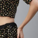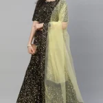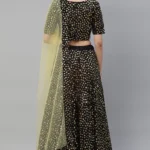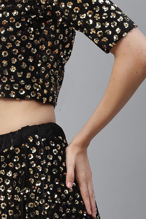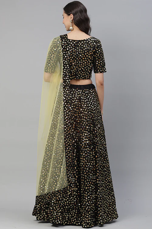 This semi-stitched Lehenga Choli set boasts a timeless black hue, adorned with yellow sequins that add a touch of Bollywood glamour. The velvet fabric exudes luxury, while the intricate embroidery showcases meticulous craftsmanship.