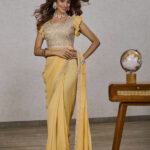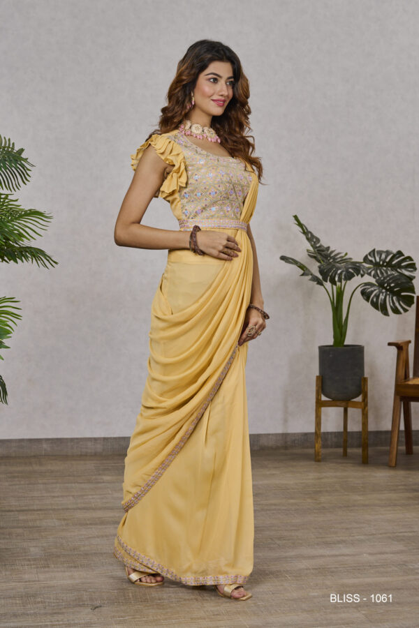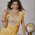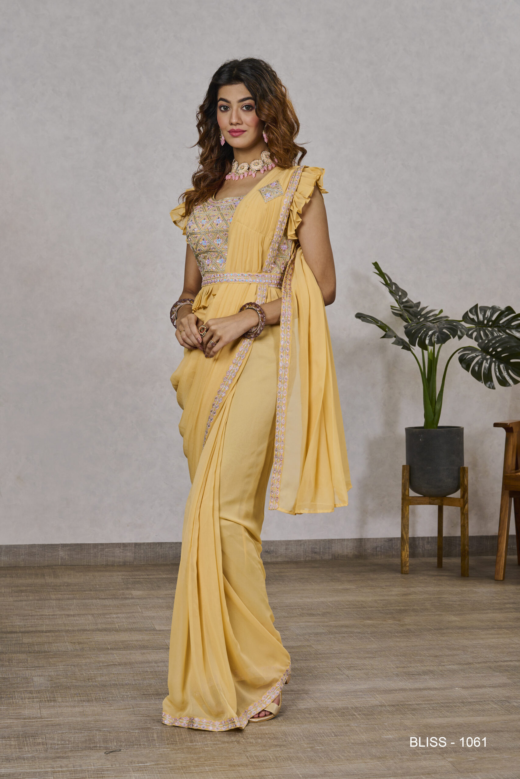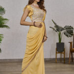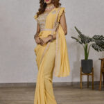 This yellow shimmer georgette saree is an elegant and attention-grabbing choice. It features embroidery and sequins work, along with a fixed broach on the pallu and a waist belt, for an unforgettable and timeless aesthetic. Ideal for formal occasions.